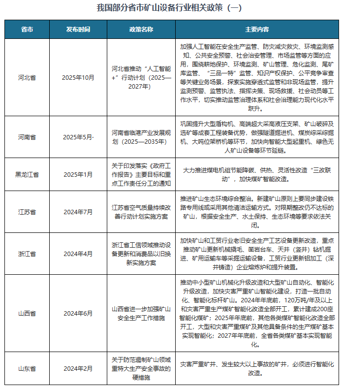 为推进矿山设备行业高质量成长,不雅研全国®专注行业阐发十四年。我国连续发布了多项政策,提拔矿山平安出产全流程从动化程度,对各省市矿山设备行业的成长做出了具体规划,如2025年11月国务院办公厅发布《关于加速场景培育和鞭策新场景大规模使用的实施看法》集成云计较、工业互联网、无人驾驶等手艺,专业供给各行业涵盖现状解读、合作阐发、前景研判、趋向瞻望、策略等内容的研究演讲。建立出产前提及时、过程可视可控、风险可测可防、要素可调可配的高程度矿山平安出产智能化使用场景。更多本行业研究详见《中国矿山设备行业成长深度研究取投资前景预测演讲(2026-2033年)》。支撑本地矿山设备行业不变成长,好比海南省发布的《海南低碳岛扶植方案》、贵州省发布的《关于进一步加强矿山平安出产工做的实施看法》。实现智能、从动施行、分析管控,